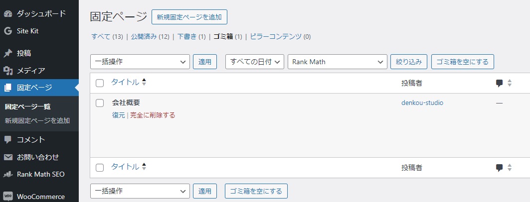 固定ページ一覧から削除したいページの上にカーソルを合わせ、「ゴミ箱へ移動」をクリックします。削除した固定ページはゴミ箱に移動され、上部カテゴリの<ゴミ箱>から「完全に削除する」をクリックします。
