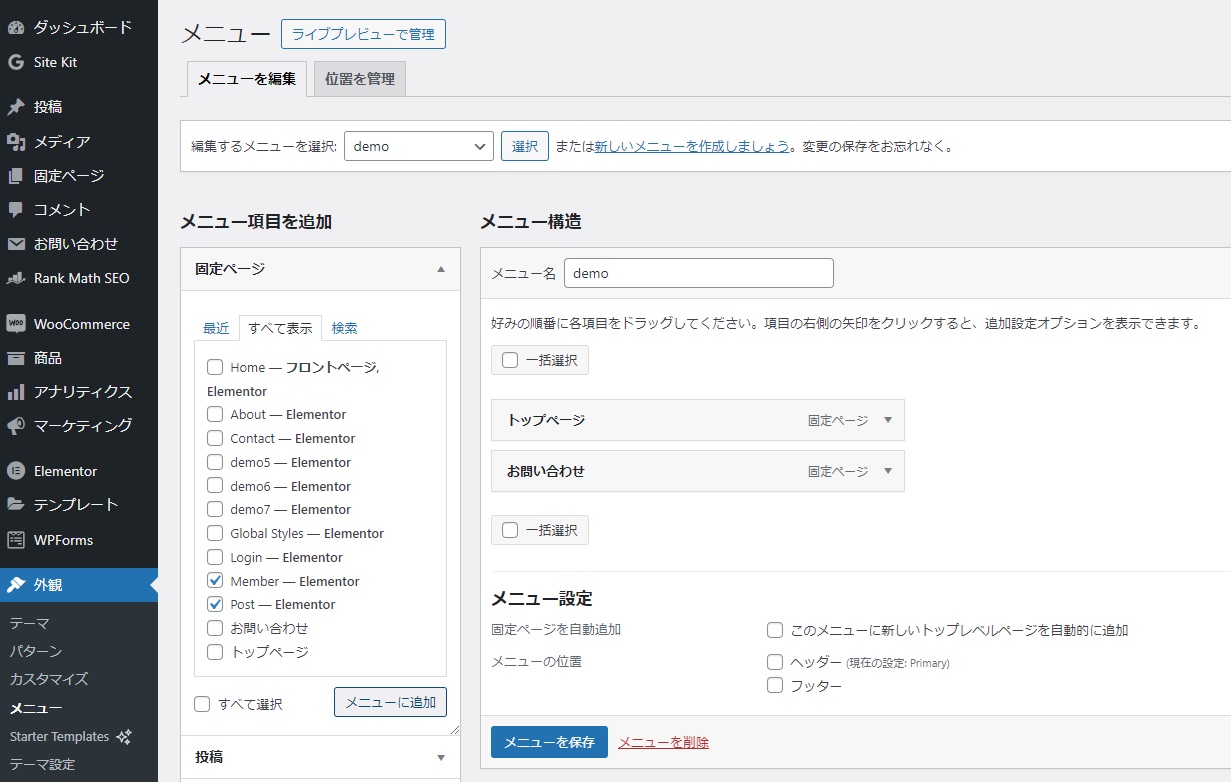 「外観」->「メニュー」を選択し、追加したい固定ページをチェックして「メニューに追加」をクリックします。メニュー内での配置をドラッグ&ドロップで調整し、「メニューを保存」ボタンをクリックして変更を保存します。メニューの構成を工夫することで、訪問者が必要な情報にアクセスしやすくなります。