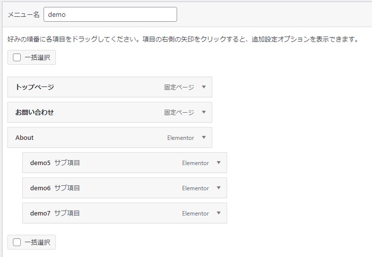 メニュー内での配置をドラッグ&ドロップで調整し、メニューとなっている固定ページの中に固定ページを入れることで、サブメニューを作成することもできます。